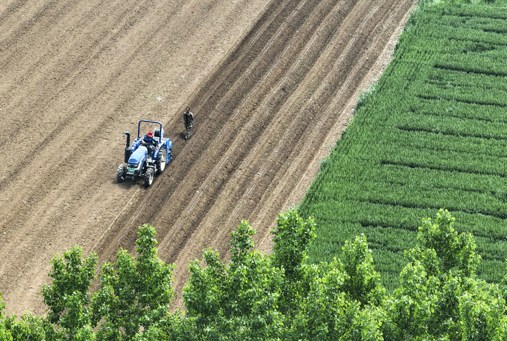 4月26日,河南省济源市克井镇农民驾驶农机在田间劳作(无人机照片)。新华社发(苗秋闹摄)