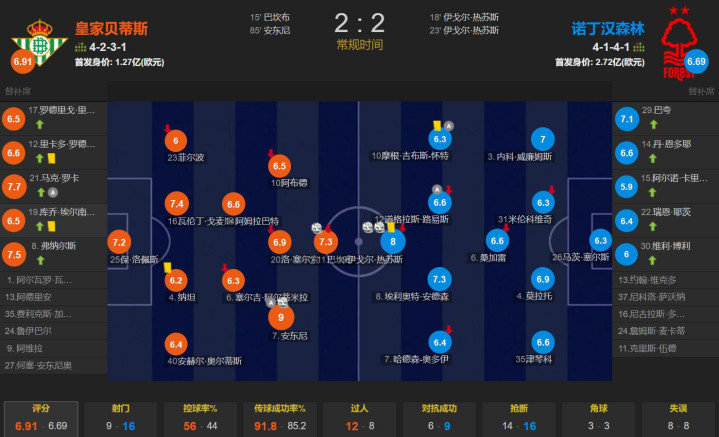 最终,贝蒂斯2-2战平诺丁汉森林!