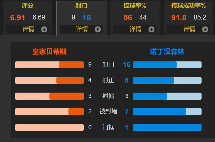 全场比赛长沙股票配资,贝蒂斯的控球率为56%,一共有9次射门,其中4次射正;诺丁汉森林一共有16次射门,其中6次射正。
